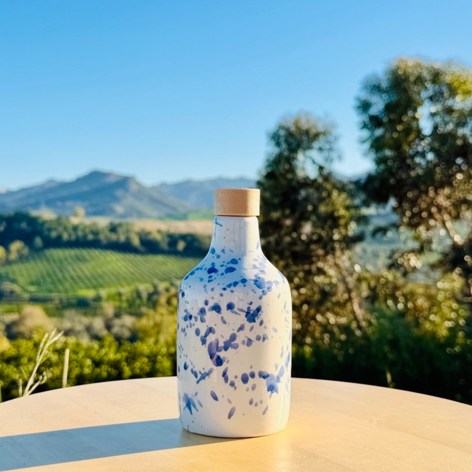 These handmade Italian ceramic oil bottles are hand-decorated with vibrant splashes of color on a pure white background. Each bottle has its own unique color accent—in green, blue, yellow, orange, or red—making the "splatter" effect vibrant and dynamic. The design is both modern and timeless.