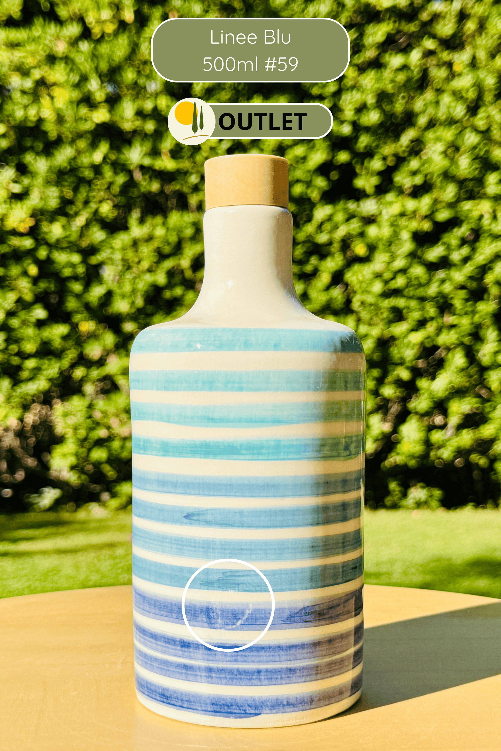 Distributore di olio in bottiglia di ceramica con linee blu per olio d'oliva fatto a mano in Italia
