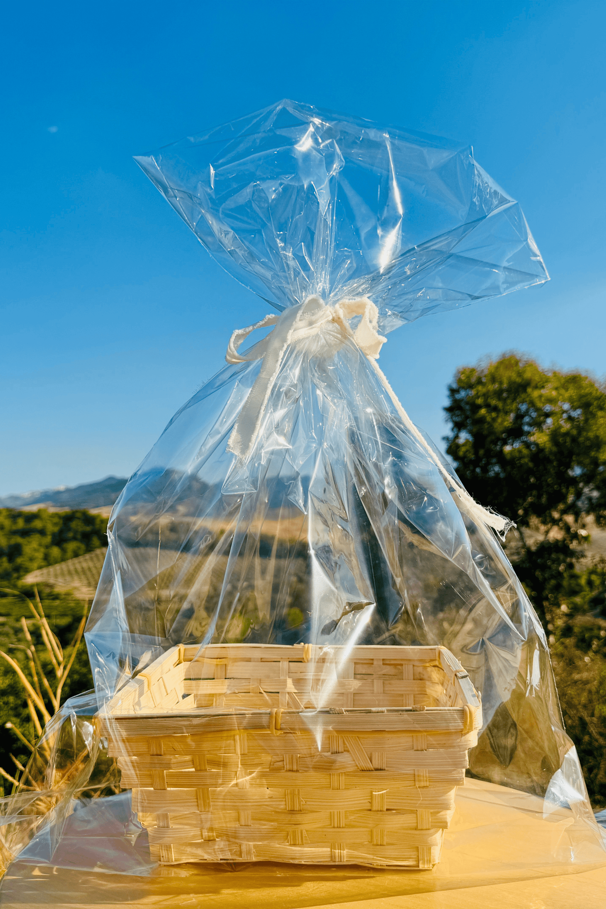 Ein leerer Geschenkkorb mit transparenter Geschenkfolie und Band, perfekt, um persönliche und liebevoll gestaltete Geschenkideen zu kreieren, ob zu Weihnachten, Geburtstag oder als Dankeschön.
