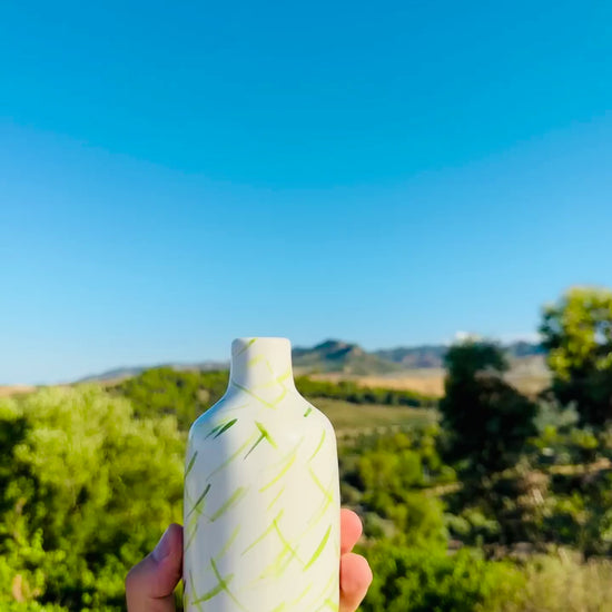 Handgefertigte Keramikflasche aus Italien – ideal zum Servieren von Olivenöl und Essig. Von Hand mit sanften grünen Pinselstrichen bemalt, die an Olivenzweige erinnern. In kleiner Auflage gefertigt. Inkl. Premium Edelstahl Ausgießer.